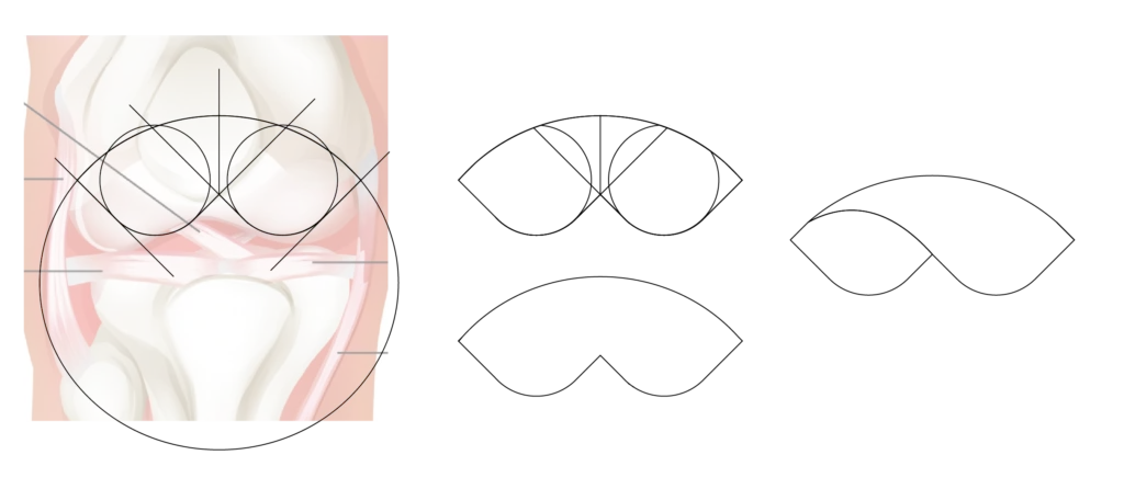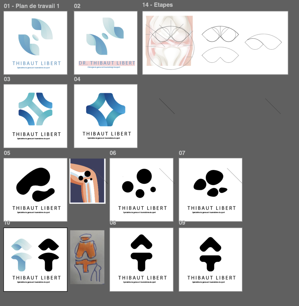 La première étape a consisté à analyser les inspirations fournies par Thibaut et à définir un axe graphique en lien avec sa spécialisation du genou. Plusieurs pistes ont été explorées : approche abstraite, monogramme, représentation des ligaments et travail géométrique autour des ménisques. C’est cette dernière proposition, construite à partir de cercles, qui a été retenue pour aboutir à une représentation épurée et cohérente du ménisque.